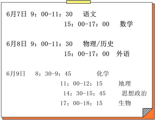 具体科目考试时间安排为:6月7日,语文9:00至11:30,数学15:00至17:00。 6月8日,文科综合/理科综9:00至11:30;外语15:00至17:00。