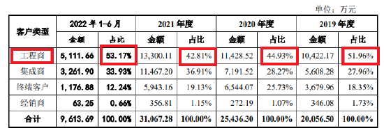 招股书显示,在世邦通信四类收入模式中,工程商客户收入占比最高。2019-2021年、2022年上半年,公司工程商客户收入分别为1.04亿元、1.14亿元、1.33亿元、0.51亿元,占当期总收入的比例分别为51.96%、44.93%、42.81%及53.17%。