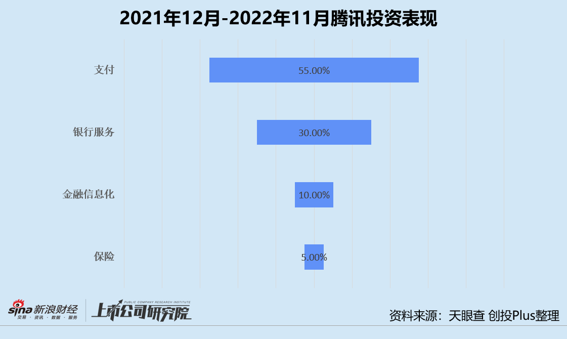 从投资阶段来看,同样整体向早期倾斜,20%为B轮融资,战略融资仅占总投资事件的14%,而2021年同期战略融资占比为42%。从所关注的行业赛道来看,腾讯偏好金融和企业服务领域,游戏投资占比大幅减少。投资频率最高的金融领域,超55%为支付项目。
