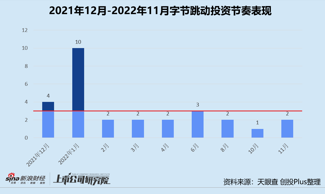 统计区间内,字节公开披露的股权投资事件共28起,同比下降54.3%。自今年年初被曝解散战略投资部后,全年投资节奏保持在每月2起左右。