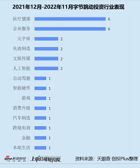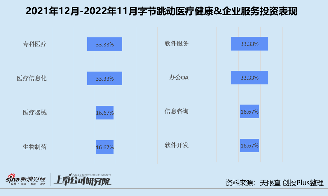 从投资阶段来看,29%为A轮融资,战略融资仅占总投资事件的7%,而2021年同期战略融资占比为47%。从所关注的行业赛道来看,字节的消费投资占比大幅减少,侧重医疗健康和企业服务领域。其中,专科医疗、医疗信息化、软件服务和办公OA项目获得融资次数最多。