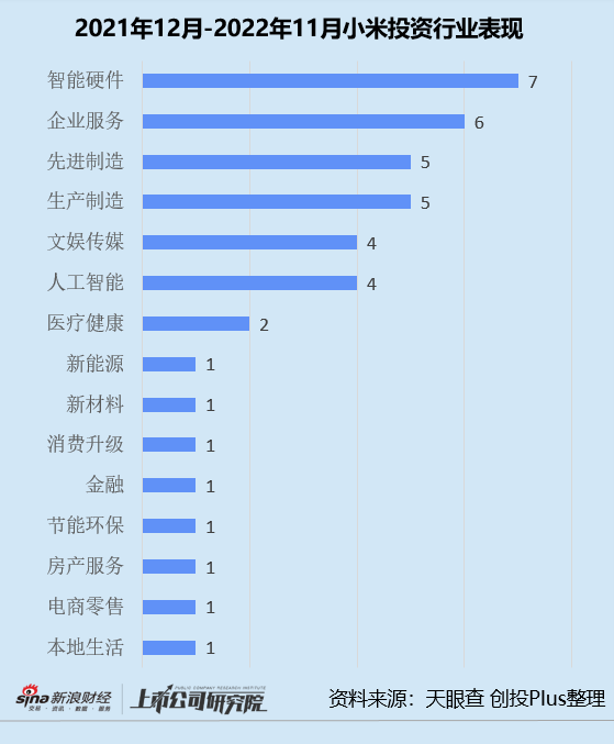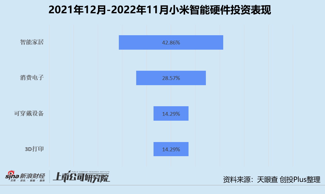 从投资阶段来看,处于早期的Pre-A轮和天使轮占比合计44%,战略融资仅占总投资事件的15%,而2021年同期战略融资占比为22%。从所关注的行业赛道来看,小米偏好智能硬件和企业服务领域。最为活跃的智能硬件领域,近43%投资于智能家居项目。