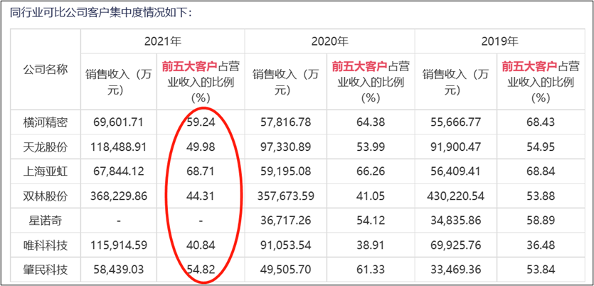 进一步对比可比同行发现,大部分可比公司的前五大客户维持在40%至68%之间。显然,利安科技的客户结构有别于同行。
