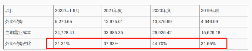 值得注意的是,公司外协采购金额占比较高。报告期内,公司的外协采购金额分别为4946.99万元、1.34亿元、1.27亿元、5270.65万元,占同期成本之比分别为31.65%、44.7%、37.63%、21.31%。