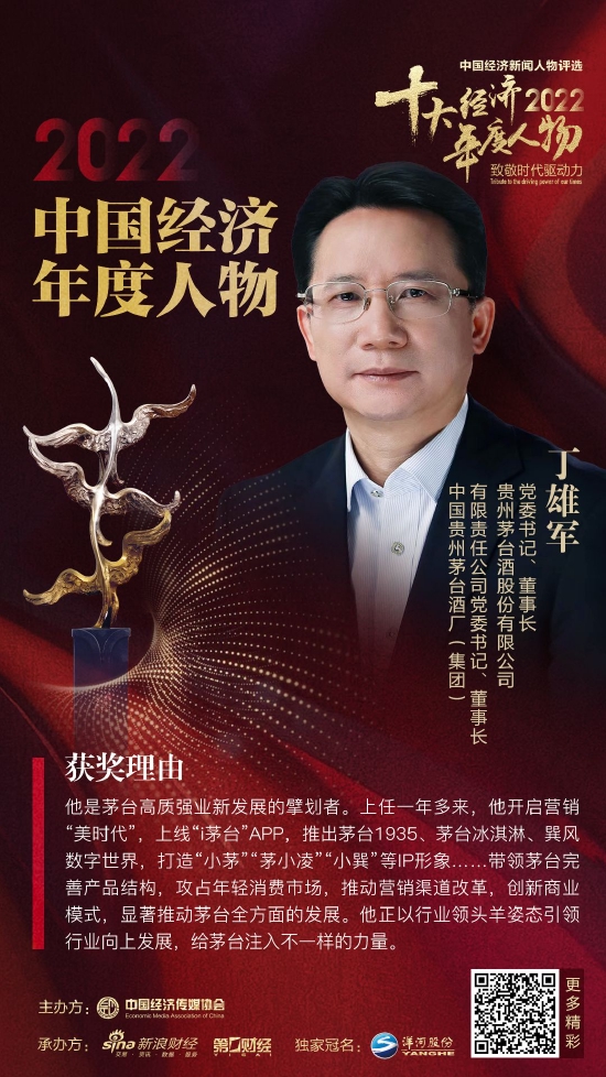 中国贵州茅台酒厂(集团)有限责任公司党委书记、董事长,贵州茅台酒股份有限公司党委书记、董事长丁雄军当选“2022中国经济年度人物”。