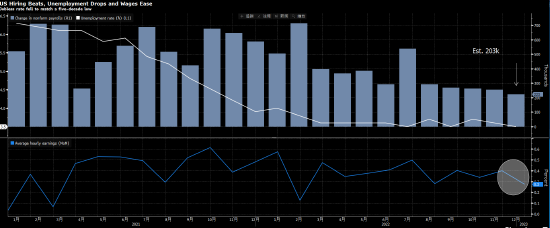 据报道,美国劳工部1月6日公布的数据显示,2022年12月美国失业率环比降至3.5%,非农业部门新增就业人数为22.3万,高于市场预期。平均时薪环比增长0.3%,同比增长4.6%。