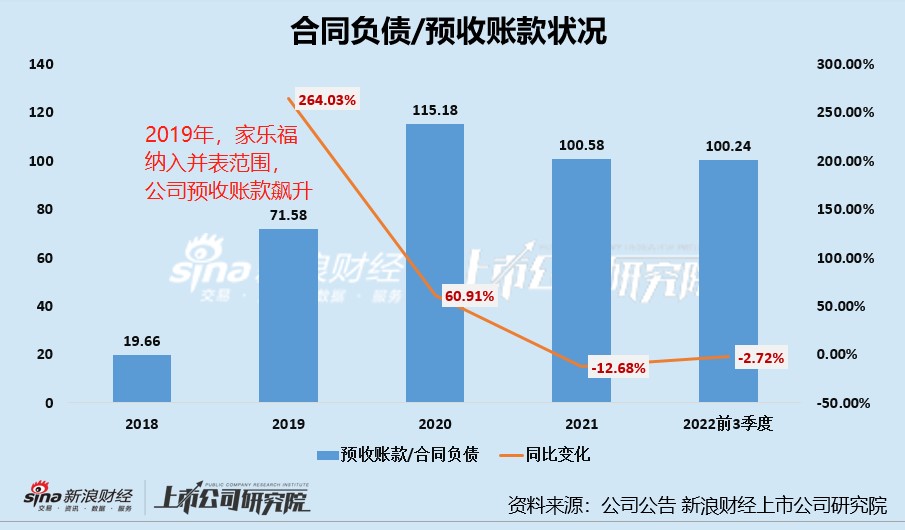 一般来说,家乐福在向消费者销售购物卡后,收到现金并计入合同负债,这也是一种商超“寅吃卯粮”的经营行为。在收购家乐福之后,苏宁易购的合同负债直线飙升,2019年公司预收账款(后统一为合同负债)71.58亿元,较2018年同期增长51.92亿元,2020年后公司合同负债维持在百亿级别,2022年前三季度合同负债金额就高达100.24亿元。