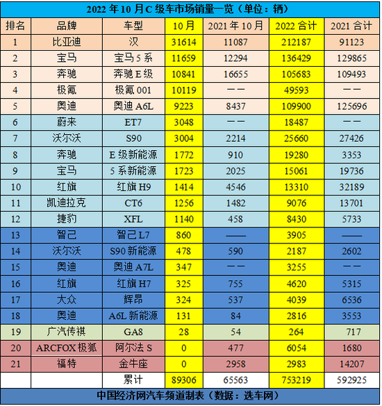 得益于新能源产品强劲增长的势头,国产C级车市场继续保持大涨。10月,国产C级车的累计销量为89306辆,与去年同期相比大幅上涨36.21%;前10个月的整体销量为753219辆,同比增长27.03%。