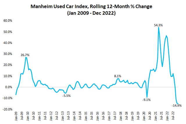 美国去年12月二手车价格同比下降14.9%,是有记录以来同比降幅最大的一次(数据来自Manheim)。该价格指数是2020年通货膨胀率上涨时的领先指标,或将继续是未来通货膨胀率下降的领先指标。