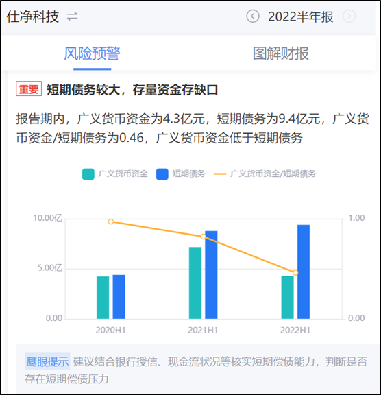 值得一提的是,鹰眼预警显示,公司的短期债务资金缺口巨大,存在较大的财务风险。2022年半年报报告期内,公司广义货币资金为4.3亿元,短期债务为9.4亿元,广义货币资金/短期债务为0.46,广义货币资金低于短期债务。截止2022年三季报末,公司账目资金仅剩4亿元,而短期借款已超9亿元。这或说明,公司短期债务资金缺口巨大,能否如期偿还相关借款,存在较大的不确定性。