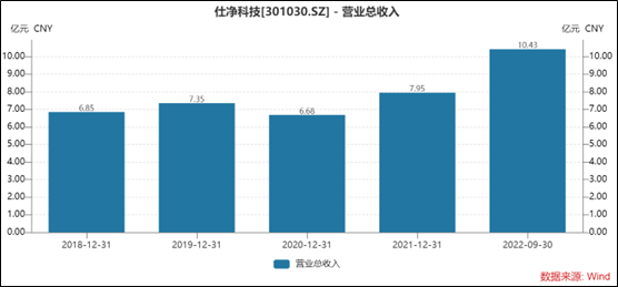 仕净科技今年业绩营收持续增长,由2020年的6.68亿元上涨至2022年三季报末的10.43亿元。
