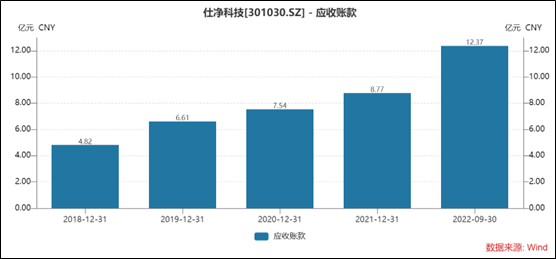 公司盈利质量欠缺的背后是大量堆积的应收款。2022年三季报末,公司应收款高达12.37亿元,占同期收入之比超过100%。