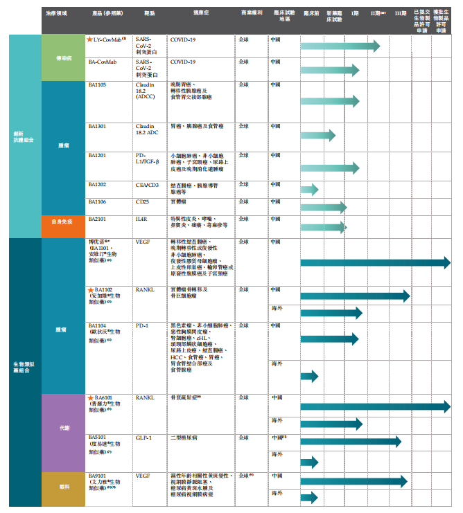 具体公司核心产品来看,1)BA1102地舒单抗注射液主要针对实体瘤骨转移及骨巨细胞瘤引,目前正在进行三期临床;2)BA6101地舒单抗注射液主要用于治疗骨质疏松症,11月获监管部门批准开始商业化;3)LY-CovMab主要用于治疗新冠;4)已经商业化的博优诺主要用于治疗转移性结直肠癌、晚期转移性或复发性非小细胞肺癌、复发性胶质母细胞瘤、上皮性卵巢癌、输卵管癌或原发性腹膜癌及子宫颈癌。