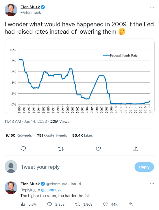 马斯克在当地时间1月14日的一条推文中写道:“利率越高,跌得就越重。”