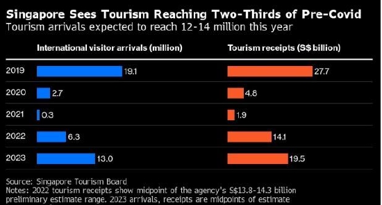 新加坡预计2023年游客人数将比去年增加一倍,达到1200万至1400万人次,是疫情前的2019年(1910万)的约七成水平,受益于中国游客的强劲回归,以及航班连通性和运力的增长。