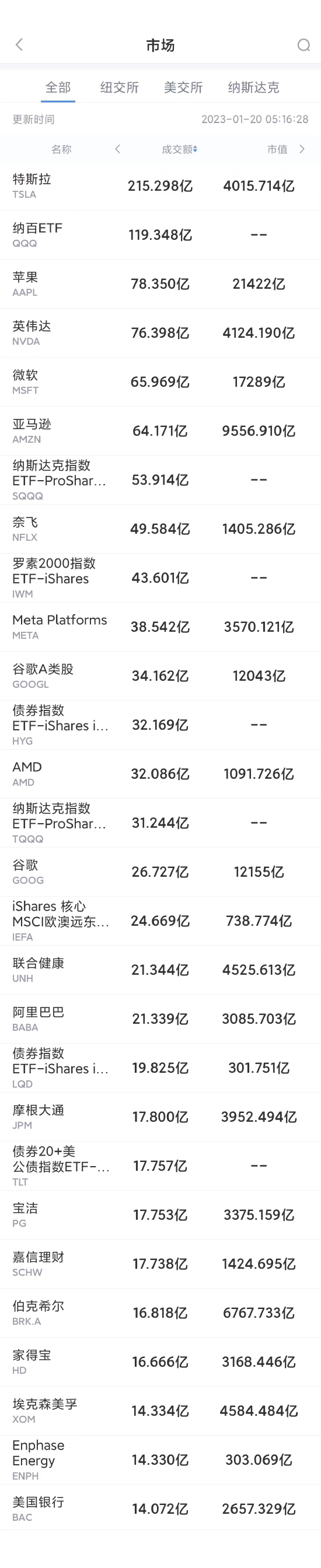 以下为美股当日交易最活跃的20只股票(按成交额):