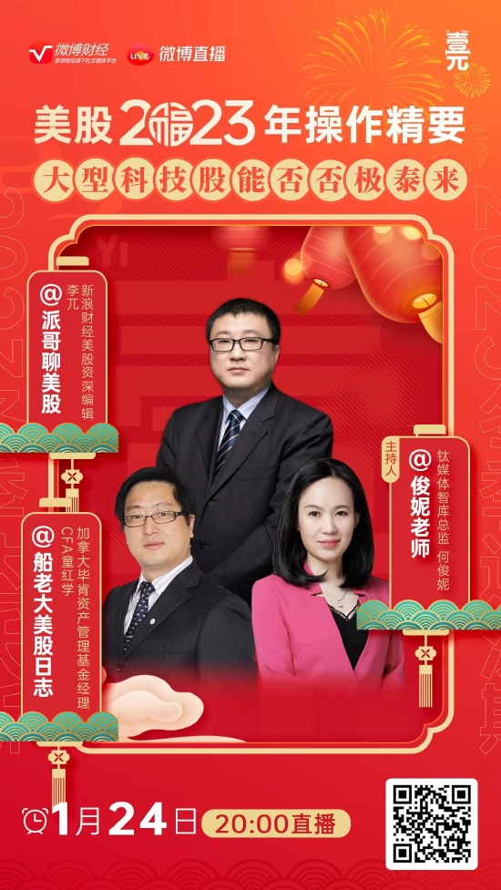 24日晚20点(初三),我们来聊一聊美股2023年操作概要,还有大型科技股能否否极泰来 ?钛媒体智库总监@俊妮老师 连线新浪财经美股编辑 @派哥聊美股、毕肯资产管理基金经理、CFA@船老大美股日志。我们一起讨论2023年美股的整体宏观背景,美股企业未来的基本面预期,还有近期美股低点反弹12%以上的后市研判...