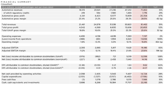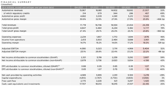 2022年第四季度又是一个打破纪录的季度,2022年也是创造纪录的一年。最后一个季度中,特斯拉实现了有史以来单季度最高营业收入、最高营业利润和最高净利润。2022全年,特斯拉的总收入同比增长51%,达到815亿美元;GAAP净利润同比翻了一倍多,达到126亿美元。
