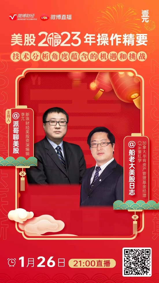 26日晚21点(初五),我们继续聊美股2023年操作精要,还有技术分析角度蕴含的机遇和挑战 。新浪财经美股编辑@派哥聊美股 将连线毕肯资产管理基金经理、CFA@船老大美股日志 。我们从技术分析角度来展望2023年美股的整体走势,以及一些具体板块和个股所蕴含的投资机会。欢迎收看!