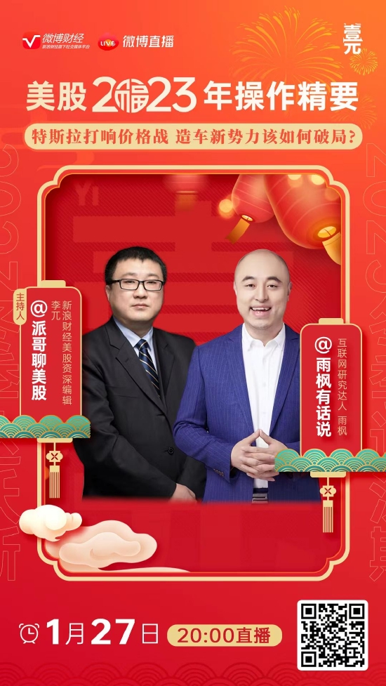 27日晚20点(大年初六),我们继续聊美股2023操作精要,今日议题是特斯拉(164.56, 4.29, 2.68%)打响价格战,造车新势力如何破局 ?新浪财经美股编辑@派哥聊美股 将连线互联网研究达人@雨枫有话说 。特斯拉(167.01, 6.74, 4.21%)接连降价,小鹏等相继推出降价举措,新能源车市开年就呈现价格大战势头。造车新势力的份额是否会被蚕食?哪家销量受影响最大?面对竞争加剧等多种复杂局面,造车新势力如何“破局”?今年的资本市场上,它们又将有何种表现?