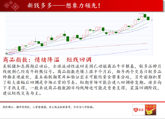 操作建议:美联储加息周期启动后,全球流动性流回美国已动摇商品牛市根基,较多品种月线级别已经有牛转熊信号。商品指数连续上涨半个月后,新年两个交易日较多品种都表现疲软,基本面假期累库和验证需求可能给资金带来分歧,另外前期积累了较大涨幅后回调是市场正常的节奏。短期市场可能会进入回调修复期。逐步向下寻找支撑,一般来说商品指数20日均线附近可能是重要支撑,震荡回调阶段,建议短线交易为主。