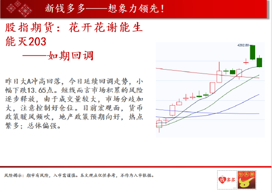 操作建议:昨日大A冲高回落,今日延续回调走势,小幅下跌13.65点。短线而言市场积累的风险逐步释放,由于成交量较大,市场分歧加大,注意控制好仓位。目前宏观面,货币政策暖风频吹,地产政策预期向好,热点繁多;总体偏强。