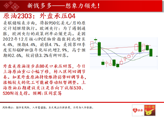 基本面概述:美联储缩表方面,将按950亿美元/月的原定计划继续执行。欧洲央行:为了遏制通胀,欧洲央行的政策利率必须更高。美国2022年12月核心PCE物价指数同比增长4.4%,预期4.4%,前值4.7%。美国第四季度实际GDP初值年化环比增2.9%,高于预期的2.6%,较前值3.2%有所回落。