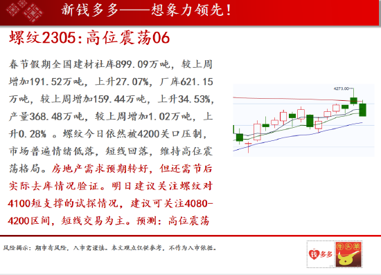 基本面概述:春节假期全国建材社库899.09万吨,较上周增加191.52万吨,上升27.07%,厂库621.15万吨,较上周增加159.44万吨,上升34.53%,产量368.48万吨,较上周增加1.02万吨,上升0.28% 。螺纹今日依然被4200关口压制,市场普遍情绪低落,短线回落,维持高位震荡格局。