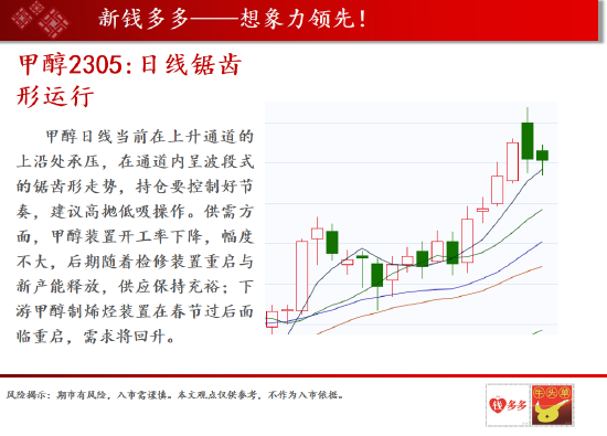 操作建议:甲醇日线当前在上升通道的上沿处承压,在通道内呈波段式的锯齿形走势,持仓要控制好节奏,建议高抛低吸操作。