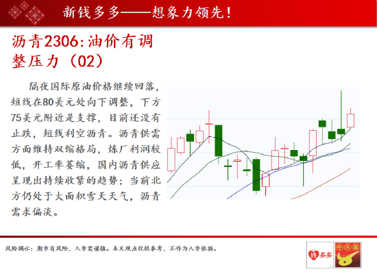 操作建议:隔夜国际原油价格继续回落,短线在80美元处向下调整,下方75美元附近是支撑,目前还没有止跌,短线利空沥青。
