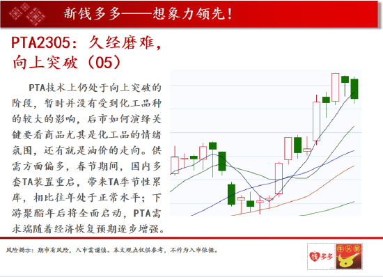 操作建议:PTA技术上仍处于向上突破的阶段,暂时并没有受到化工品种的较大的影响,后市如何演绎关键要看商品尤其是化工品的情绪氛围,还有就是油价的走向。