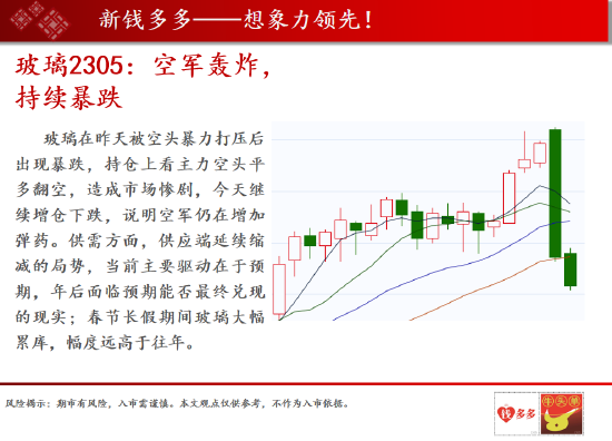 操作建议:玻璃在昨天被空头暴力打压后出现暴跌,持仓上看主力空头平多翻空,造成市场惨剧,今天继续增仓下跌,说明空军仍在增加弹药。