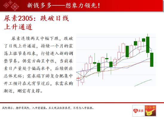 操作建议:尿素连续两天中幅下跌,跌破了日线上升通道,持续一个月的震荡上涨节奏结束,行情进入新的调整节奏。