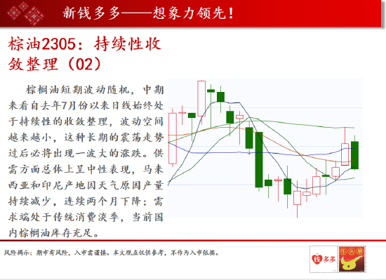 操作建议:棕榈油短期波动随机,中期来看自去年7月份以来日线始终处于持续性的收敛整理,波动空间越来越小,这种长期的震荡走势过后必将出现一波大的涨跌。
