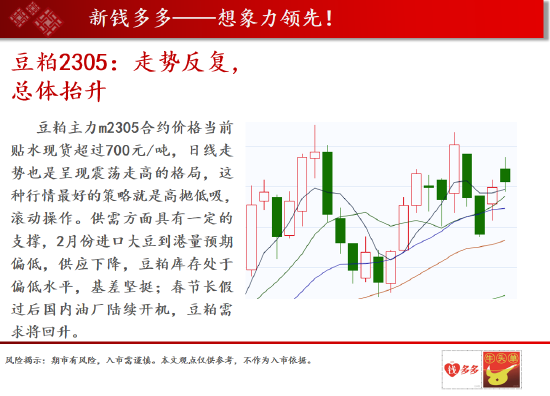 操作建议:豆粕主力m2305合约价格当前贴水现货超过700元/吨,日线走势也是呈现震荡走高的格局,这种行情最好的策略就是高抛低吸,滚动操作。