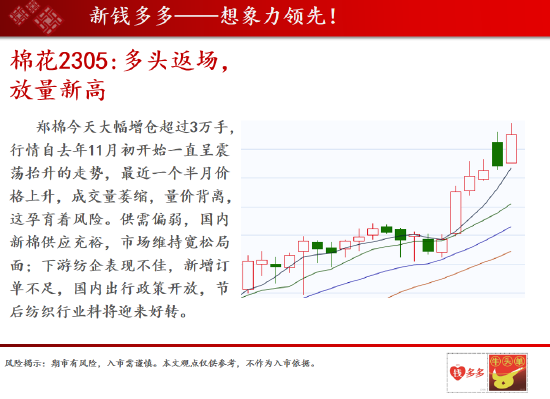 操作建议:郑棉今天大幅增仓超过3万手,行情自去年11月初开始一直呈震荡抬升的走势,最近一个半月价格上升,成交量萎缩,量价背离,这孕育着风险。