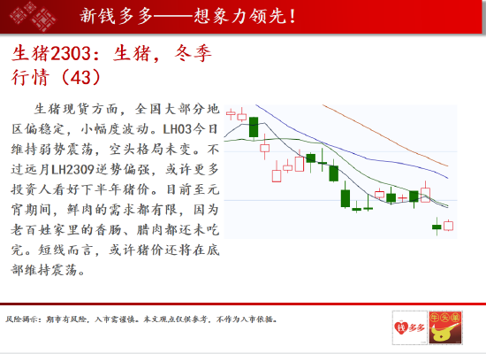 操作建议:LH03今日维持弱势震荡,空头格局未变。不过远月LH2309逆势偏强,或许更多投资人看好下半年猪价。目前至元宵期间,鲜肉的需求都有限,因为老百姓家里的香肠、腊肉都还未吃完。短线而言,或许猪价还将在底部维持震荡。