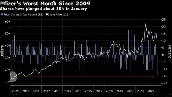该股1月份累计下跌了14%,市值蒸发约430亿美元。辉瑞周二发布的2023年业绩指引显示,其新冠疫苗和药物的销售前景弱于预期。当天该公司股价在涨跌之间波动,最终在大盘反弹的推动下以1.4%的涨幅收盘。