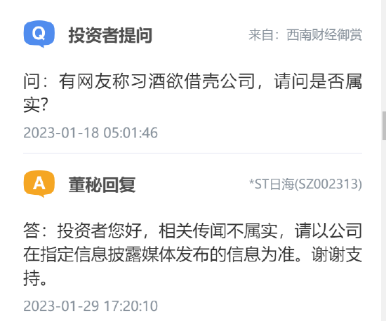 近日,有投资者在投资者关系平台提问*ST日海称,网友称习酒欲借壳公司,请问是否属实?1月29日,*ST日海董秘回复,相关传闻不属实,请以公司在指定信息披露媒体发布的信息为准。此外,近期市场还有传闻称“习酒借壳泰永长征上市”。对此,泰永长征在互动平台表示,近期市场传闻习酒借壳上市泰永长征不属实。