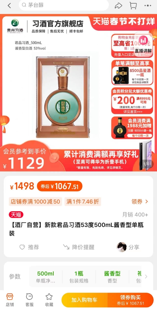 君品习酒于2019年7月上市,定价1399元/瓶,目前建议零售价1498元/瓶,仅比飞天茅台低一元。而目前在天猫习酒官方旗舰店,君品习酒到手价约1100元,与建议零售价相差400元左右。
