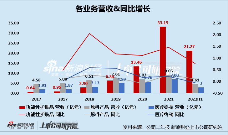 功能性护肤品确实为华熙生物带来了活力。通过公司近5年业绩表现可以看到,2018-2021年,功能性护肤品业务同比增长205.04%、118.53%、112.19%、146.57%,业绩增速远超其原料产品和医疗终端,成为华熙生物增速最快的业务板块。