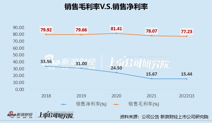 但伴随着护肤业务营收占比的提升,也使得公司销售费用持续走高,2022年前三季度,华熙生物销售费用率高达46.98%,也就是说,公司近一半的收入都用于产品营销。行业“高毛利、低净利”的特性进一步凸显,公司净利率水平频频下挫。