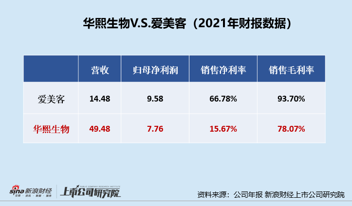同时,通过与昔日竞争对手爱美客的比较,也能看出来医美产业链上游的盈利能力有多强了。爱美客的业务主要集中于注射医美领域,而华熙生物则是多次尝试了业务多元化拓展。首先,从营收和净利润规模来看,爱美客的营收体量虽不到华熙生物的30%,但其归母净利润却超出了华熙生物。