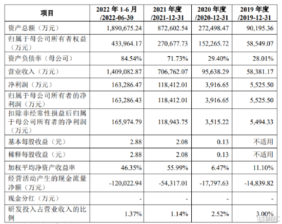 报告期内,湖南裕能实现营业收入分别为5.84亿元、9.56亿元、70.68亿元、140.91亿元,其中,2021年营业收入同比增长638.99%,2022年1-6月营业收入较上年同期增长848.20%;净利润分别为5525.50万元、3916.65万元、11.84亿元、16.33亿元。