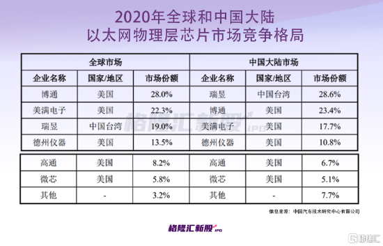 以太网物理层芯片领域长期以来,被美国博通、美满电子、 德州仪器、高通和中国台湾瑞昱五家国际巨头占据全球超过90%的市场份额,呈现高度集中的市场竞争格局。