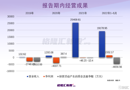 业绩方面,2019年至2022年1-6月各报告期,公司的营业收入分别为132.62万元、1295.08万元、2.54亿元和1.92亿元,相对应的净利润分别为-2748.99万元、-4037.71万元、-46.25万元、1532.17万元。