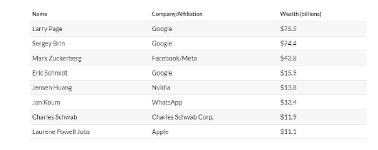 其中8位亿万富翁的财富超过了硅谷底层一半家庭的财富总和,而其中7位来自科技业。他们是谷歌联合创始人拉里·佩奇和谢尔盖·布林,谷歌前CEO埃里克·施密特,Meta首席执行官马克·扎克伯格,英伟达CEO黄仁勋,WhatsApp联合创始人Jan Koum,以及乔布斯的遗孀劳伦斯·鲍威尔·乔布斯。