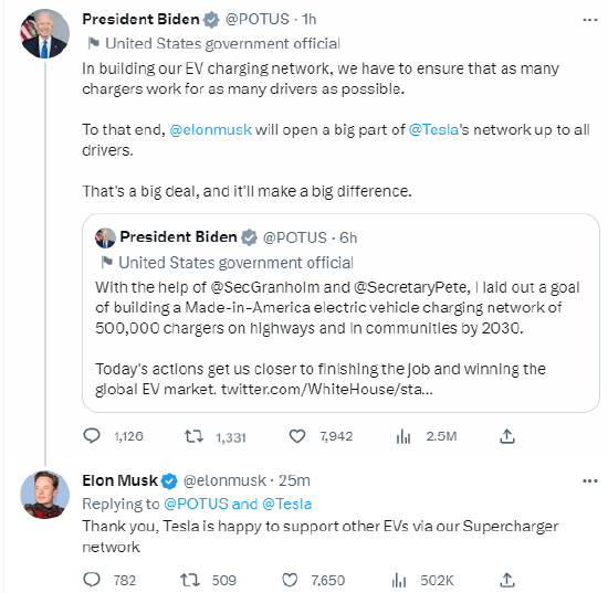 当地时间周三,白宫宣布特斯拉将首次向竞争对手开放其在美国的部分充电网络。此举是75亿美元的联邦高速公路电气化和减少碳排放计划的一部分。拜登在推特上表示,这是一件大事,意义重大。马斯克在评论中回应道“谢谢。能用我们的充电网络服务到其它电动汽车,特斯拉很开心。”