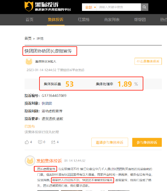 根据黑猫大数据中心数据,截止2月15日,黑猫投诉平台上关于“小程序”相关投诉有近10万单。有多名用户集中反馈参与快团团购买了当地洗浴自助门票,实际环境与宣传偏差较大,商家开业时间一推再推,最后也没有开业,目前商家的人已经找不到,团长还嘲笑参团人傻。
