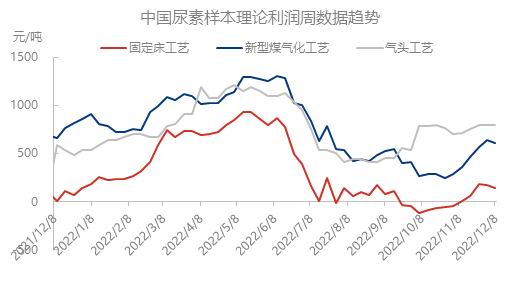 从利润来看,2022年上半年国内尿素利润持续攀升,整体高于过去两年水平,其中新型煤气化工艺和气头工艺利润在6月份均超过1000元/吨,固定床工艺利润也达到800元/吨附近水平。但下半年利润持续下降,固定床工艺利润在9-10月份进入亏损态势。进入12月,成本端有所下移,尿素利润有所修复。据隆众资讯测算,截至12月8日,煤制固定床工艺理论利润为140元/吨,煤制新型水煤浆工艺理论利润为605元/吨,气制工艺理论利润798元/吨。